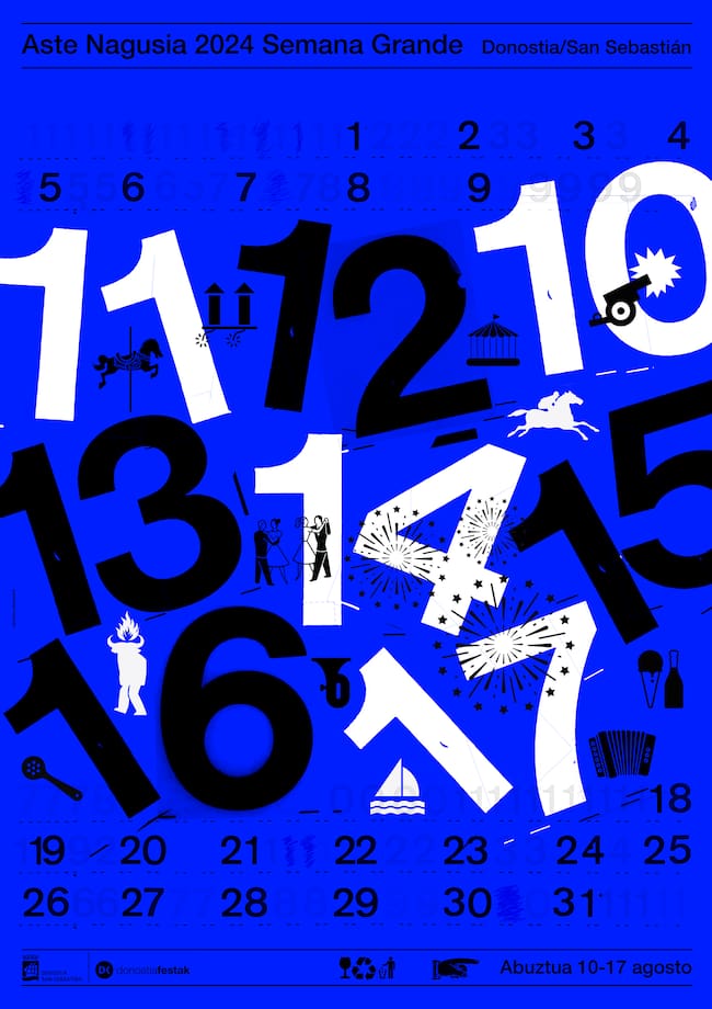 El cartel emula lo que representa el calendario propio del mes de agosto, que en Donostia arranca de forma rutinaria y uniforme, representada por los números tachados, hasta que llega la explosión de la Semana Grande. Esta explosión se reproduce con los números crecidos de tamaño. Unos números que casi no caben en el calendario, que se salen por los márgenes y “bailan” unos con otros, proyectando una imagen de fiesta y diversión, que se muestran con iconos que representan muchas de las actividades propias de la Semana Grande: fuegos, bailables, charangas, deportes, música…