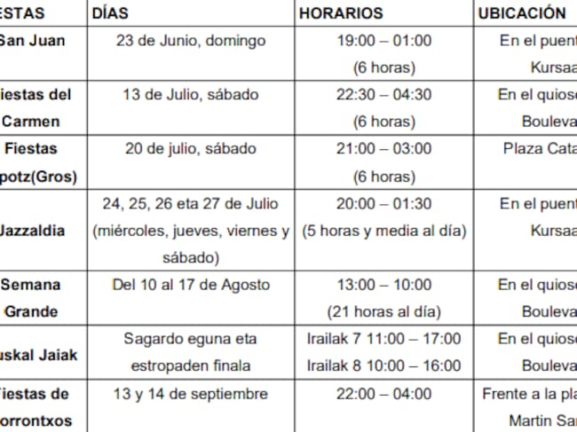 La campaña con reparto de material en bares y colocación de un punto de información se inicia con los San Juanes del 23 de junio (punto en el puente del Kursaal), abarca el Jazzaldia (punto en el puente del Kursaal), Karmengo Jaiak (punto en el puerto), Zipotz Jaiak de Gros (punto en Plaza Cataluña), Semana Grande (punto en el kiosko del Boulevard), Euskal Jaiak incluyendo los dos domingos de regatas (punto en el kiosko del Boulevard), Porrotxos de Egia (punto en Virgen del Carmen)y alcanzará la celebración de Santo Tomás el 21 de diciembre (punto en el kiosko del Boulevard).