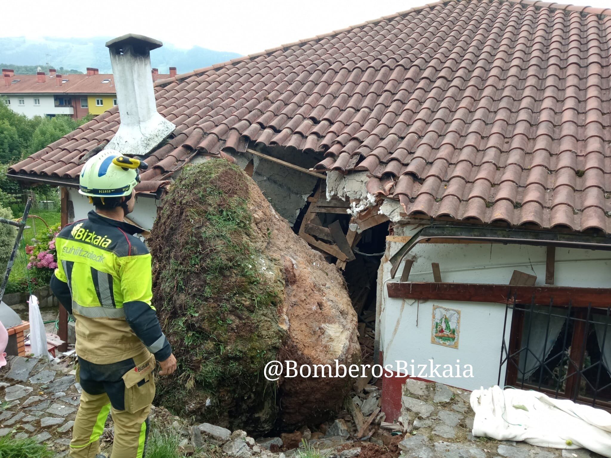 Una enorme roca se ha desprendido de un monte y se ha estrellado contra una parte de un caserío en el barrio de Arretxinaga. Afortunadamente, en el momento del impacto no había nadie en esa zona de la casa, por lo que no se registran heridos. Sin embargo, los daños causados afectan el suministro de gas, electricidad y agua, obligando a la intervención de los bomberos para controlar una fuga de gas y prevenir otros posibles incidentes mientras retiran la roca.