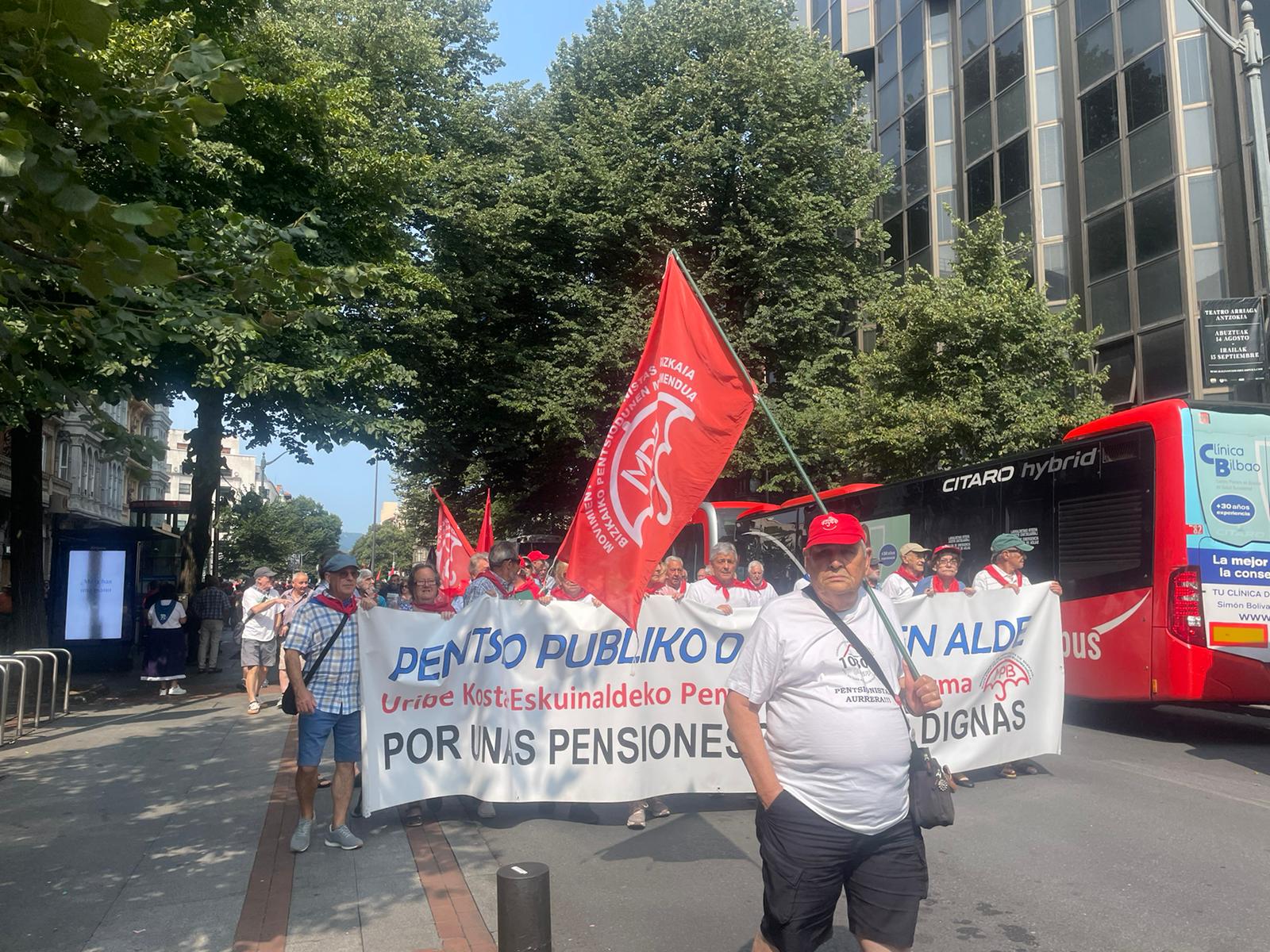 Este lunes, en pleno arranque de Aste Nagusia de Bilbao, miles de personas se han concentrado para participar en la manifestación organizada por el Movimiento de Pensionistas de Bizkaia. La marcha, ha comenzado a las 12 del mediodía y ha culminado frente al Ayuntamiento de Bilbao