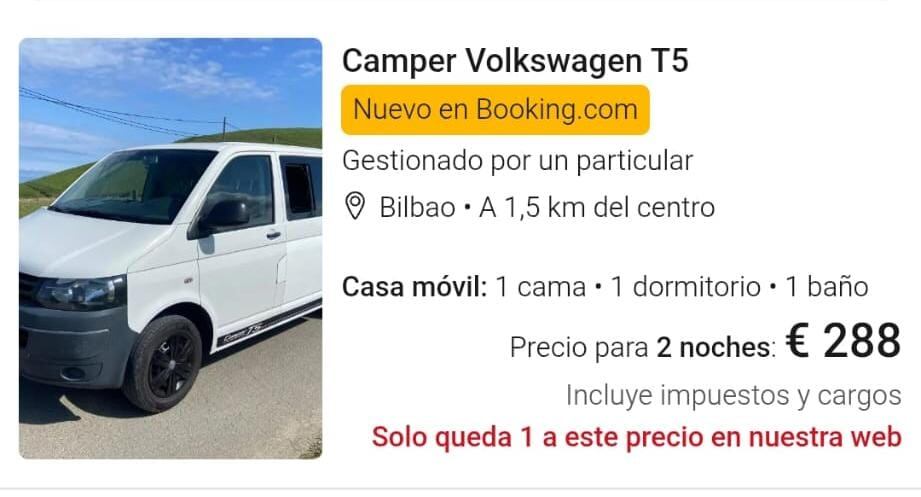 Uno de los casos más comentados ha sido el de una furgoneta Volkswagen T5 camperizada anunciada en Booking como “alojamiento completo” para una persona, situada a 1,5 kilómetros del centro. El anuncio la presenta como una “casa móvil” equipada con una cama , un dormitorio y un baño. El precio, 288 euros para dos noches