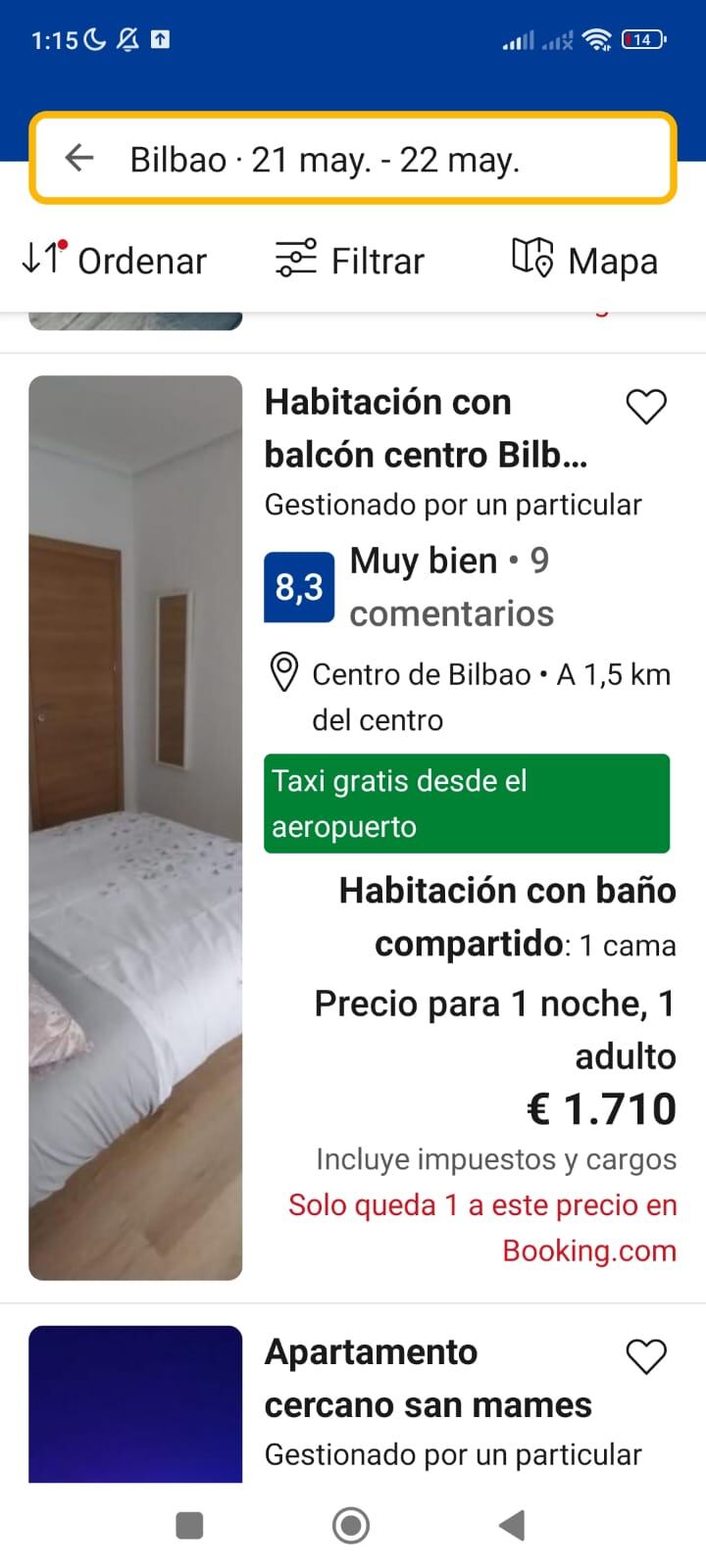 Entre los anuncios localizados en Booking, todos con fecha de entrada el 21 y salida el 22 de mayo, se observan viviendas particulares que alquilan habitaciones por una sola noche, a precios elevados, pero sin ofrecer servicios típicos de alojamientos turísticos: baño compartido, uso limitado de la cocina, check-in condicionado, y políticas de cancelación restrictivas. Se ofrece una habitación con baño compartido a razón de 1.700 euros la noche