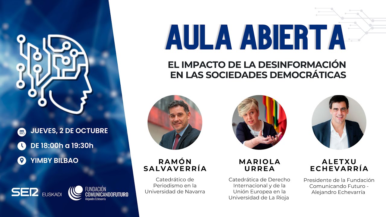 El Aula Abierta de la Cadena SER, celebrado este jueves en Bilbao, puso sobre la mesa un debate urgente: cómo la desinformación erosiona la confianza ciudadana y amenaza la calidad democrática. En el encuentro participaron la profesora de Derecho Internacional Mariola Urrea, el catedrático de Periodismo de la Universidad de Navarra Ramón Salaverría y el presidente de la Fundación Comunicando Futuro-Alejandro Echevarría y consultor en comunicación digital Aletxu Echevarría.
