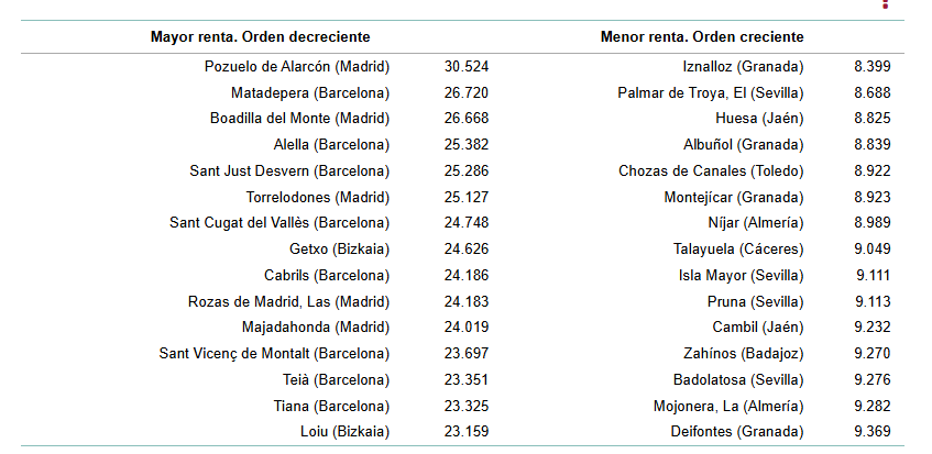 A nivel nacional, los municipios con mayor renta se concentran en comunidades como Madrid y Cataluña. Por ejemplo, entre los 50 municipios con mayor renta bruta per cápita aparecen localidades como Pozuelo de Alarcón, Boadilla del Monte o Sant Cugat del Vallès, que superan ampliamente los valores registrados en los vascos.