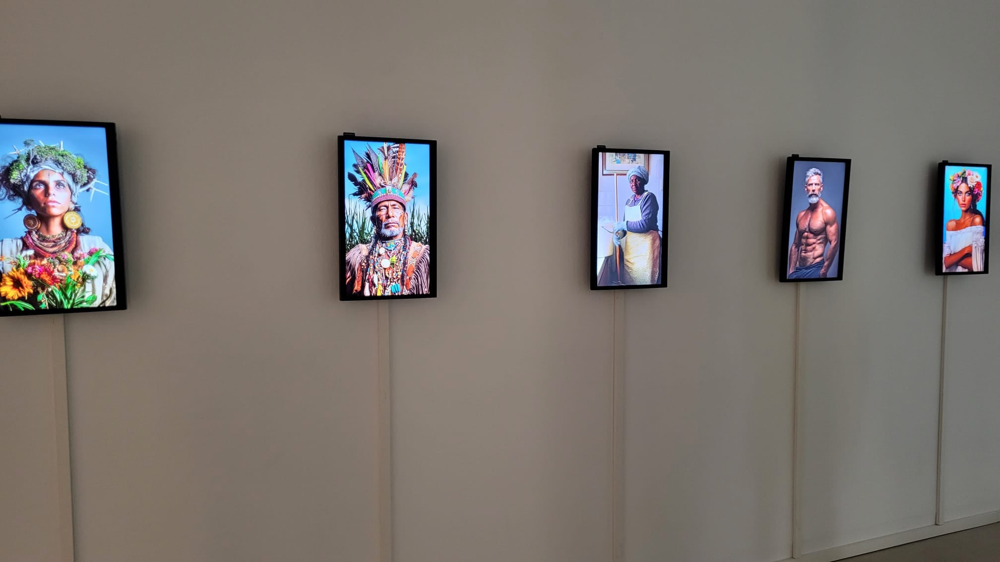 Otra de las salas con la que nos encontramos muestra cinco bustos generados por IA que reproducen clichés: la activista hippie, el hombre hipermusculado, la mujer con flores, el indígena con plumas, la ama de casa racializada. Todos hablan, interpelando al espectador.