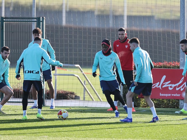 El delantero del Athletic de Bilbao Nico Williams (c), entre otros, prepara la Supercopa de España que disputa en Arabia y en la que se medirá en la primera semifinal el miércoles al Barcelona en el King Abdullah Sports City de Yeda / LUIS TEJIDO (EFE)
