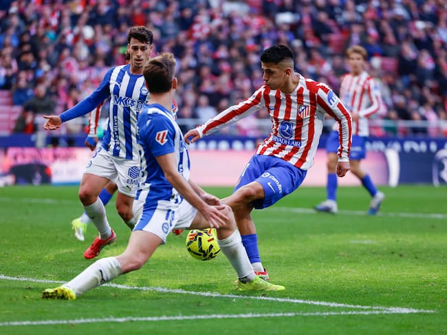 MADRID, 18/01/2026.-El jugador del Atlético de Madrid Thiago Almada y el jugador del Alavés Pablo Ibáñez, durante el partido de LaLiga EA Sports entre el Atlético de Madrid y el Alavés, este domingo en el estadio Riyadh Air Metropolitano en Madrid.-EFE/ Manu Reino / Manu Reino (EFE)