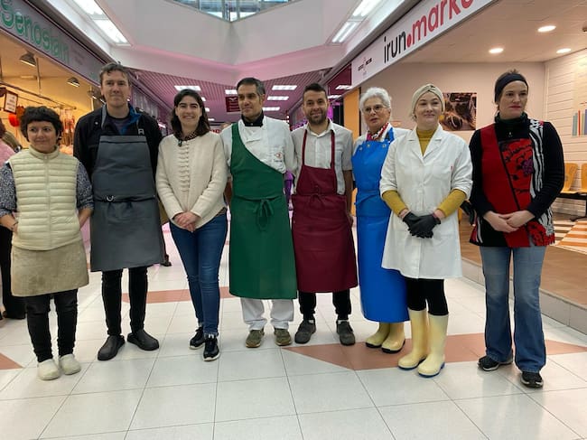 Nuria Alzaga, delegada de Promoción Económica del Ayuntamiento de Irun, junto a responsables de distintos puestos del mercado