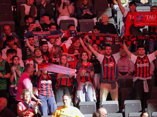 VALENCIA, 20/02/2026.- La afición del Baskonia durante el encuentro correspondiente a los cuartos de final de la Copa del Rey disputado este viernes entre el Baskonia y La Laguna Tenerife en el Roig Arena de Valencia. EFE/ Manuel Bruque / Manuel Bruque (EFE)