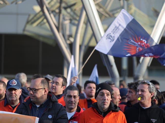 BILBAO, 26/02/2026.-Trabajadores convocados por el comité de empresa de Tubos Reunidos en Amurrio (Álava) este jueves durante la concentración en Bilbao con motivo del traslado a la capital vizcaína de las negociaciones del ERE de extinción de contratos presentado por la dirección.EFE/Luis Tejido / LUIS TEJIDO (EFE)