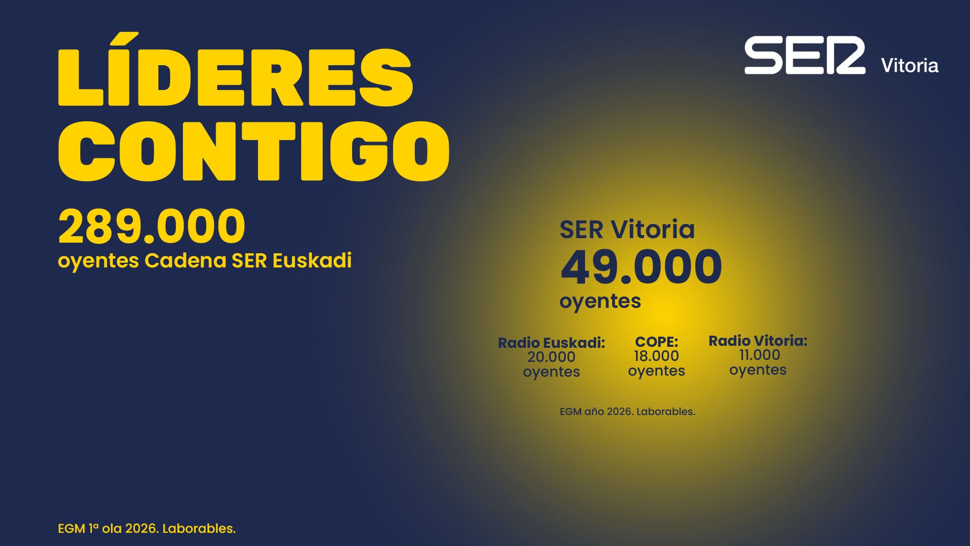 La Cadena SER revalida una vez más el liderazgo de la radio en Álava, según la primera ola del Estudio General de Medios publicado hoy mismo, con 49.000 oyentes, la suma de la audiencia de sus tres inmediatos competidores, Radio Euskadi con 20.000, Cope con 18.000 oyentes y Radio Vitoria con 11.000. Uno de cada dos oyentes alaveses de radio generalista escucha la Cadena SER. El liderazgo de la SER se extiende a la escucha en internet, en streaming y en podcast.