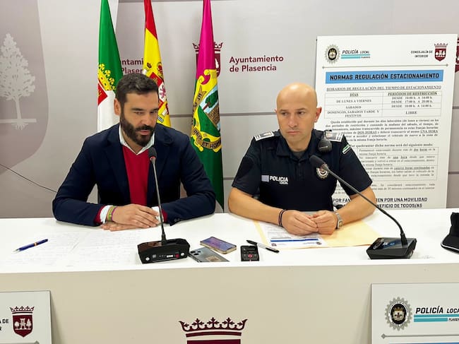 David Dóniga, concejal de interior, y Gonzalo David, sub-inspector de la Policía Local de Plasencia, en rueda de prensa. / Andrés Gómez