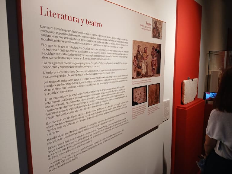 Los siguientes ámbitos son literatura y teatro, y es que, los textos literarios greco-latinos conforman el sustrato del teatro clásico, del que se han conservado muchas obras. La fuerza del teatro clásico era la palabra, Logos, que emanaba detrás de la máscara que portaba el actor en escena. Así nos los muestran mosaicos, pinturas o relieves coetáneos: actores con máscaras representando sus personajes, por lo que aquí se destaca la placa de mima Cornelia Nothis, actriz del Teatro Romano de Mérida.