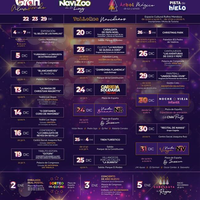 Lozano añade que entre estas actividades no faltará la música, los villancicos, magia y otros espectáculos. Así, el Palacio de Congresos acoge un concierto solidario del 25 aniversario de AFAD el 19 de diciembre, el esectáculo de los “Cantajuegos” el día 26 o el concierto de Año Nuevo de la Orquesta de Extremadura que tendrá lugar el 3 de enero.