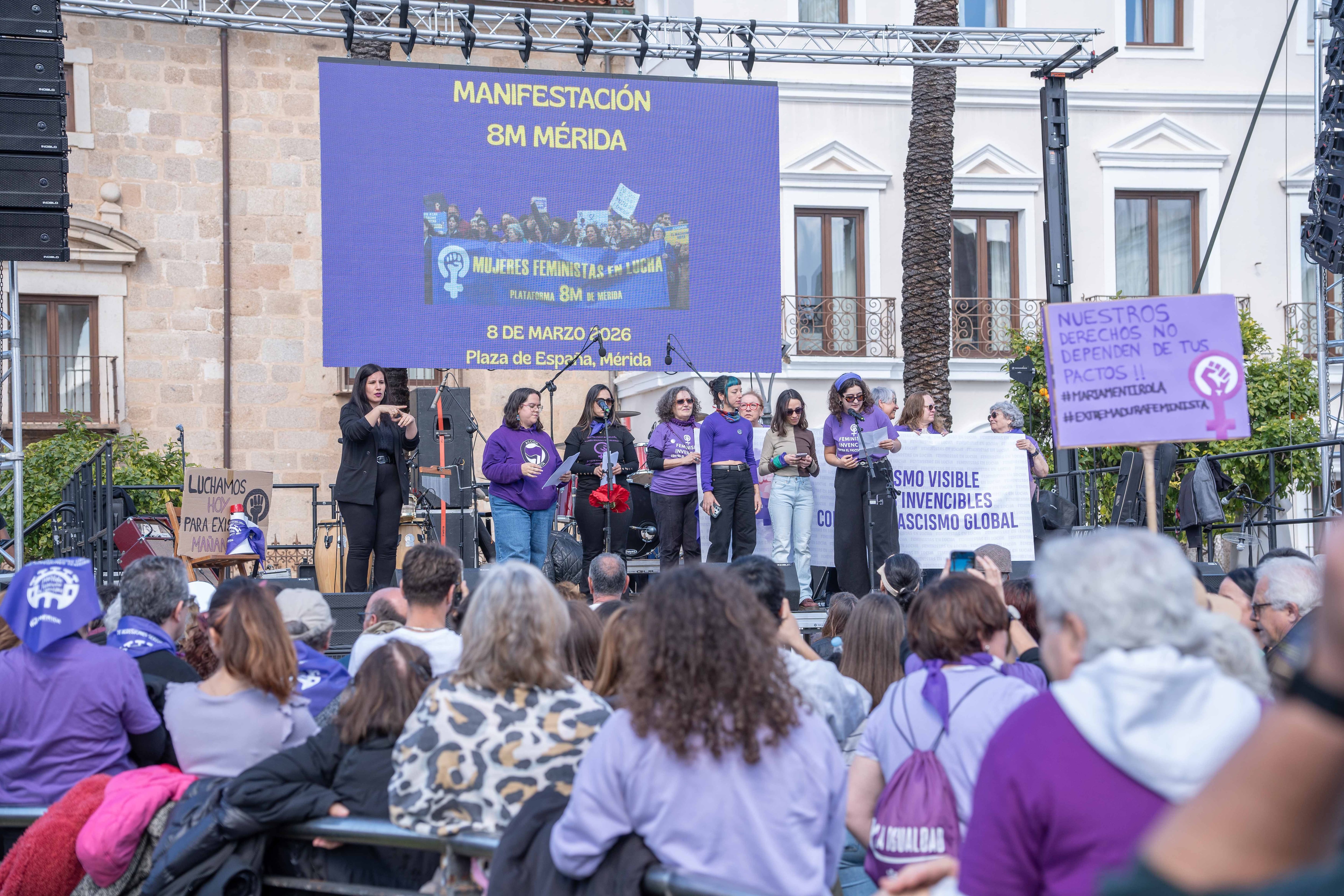 "Este 8M tenemos un significado mucho más grande: el del no a la guerra y el de luchar contra el fascismo global que intenta utilizar los derechos de las mujeres como mercancía, como instrumento de cambio político y como un arma para arrojarnos en situaciones de conflicto bélico", aseguraba Marisa Tena, de la Plataforma 8M convocante de la marcha en la capital de Extremadura.