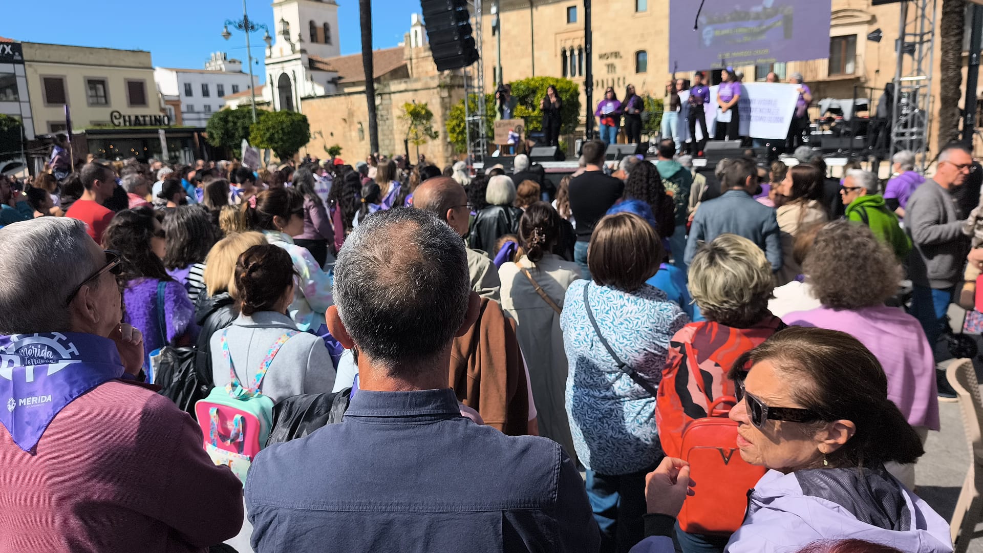 Vista de la Plaza de España emeritense durante lectura del manifiesto por el 8M.
