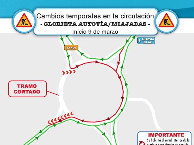 Anuncian cambios temporales de circulación en la glorieta que conecta la EX-106 con la EX-A2