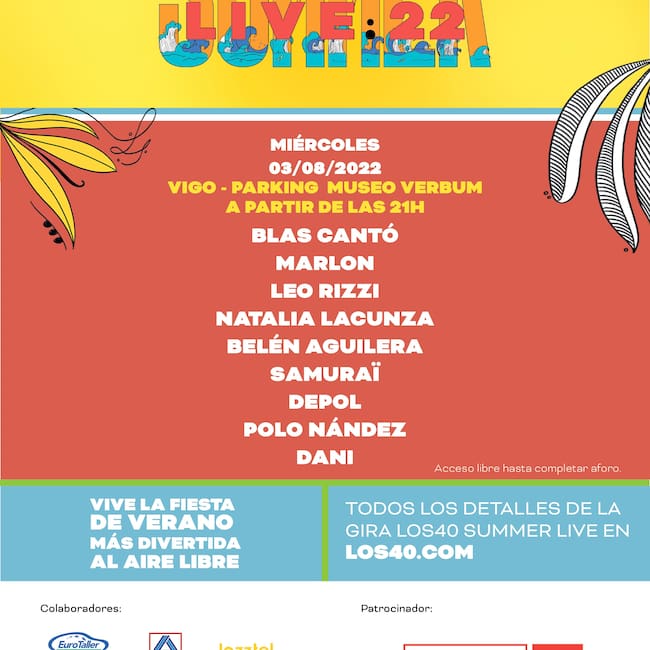 “Los40 Summer Live” contará con diversos artistas nacionales sobre el escenario: BLAS CANTÓ, ganador del concurso televisivo TU CARA ME SUENA y representante de España en Eurovisión el año 2021, MARLON, grupo asturiano formado por Adrían Roma, Juanin y Jorge fueron el artista revelación de LOS40 en el año 2016, DEPOL, nuevo artista de la escena nacional, conocido por su participación en Got Talent España BELÉN AGUILERA, participó en LA VOZ, fue telonera del concierto de la gira de O.T. y más conocida como “Thegirlandthepiano” por su trayectoria como pianista, LEO RIZZI, su último video single “Amapolas” es todo un hit y no para de subir en la lista de LOS40 ocupando el numero 21, SAMURAÏ, la madrileña irrumpía a inicios de este 2022 con su “punk-pop”, con temas como “tirando balas”, POLO NÁNDEZ, estuvo en la Gira LOS40 SUMMER LIVE 2019 y vuelve a Vigo para mostrarnos su crecimiento artístico como artista de pop-latino, NATALIA LACUNZA, esta compositora e intérprete pamplonica particpó en la décima edición de O.T. quedando tercera. Tras éxitos como “otras alas”, este año 2022 ha lanzado su hit “Cuestión de suerte”, DANI, es el nombre artístico de Daniela Díaz Costas, una joven compositora y cantante viguesa, apoyada desde sus inicios por el programa MAKETÓN MAELOC de LOS40 Vigo, actualmente sus singles son “Ceras rosas” o “lento”. Para finalizar se cerrará el evento con la sesión del DJ de Los40 David Álvarez.