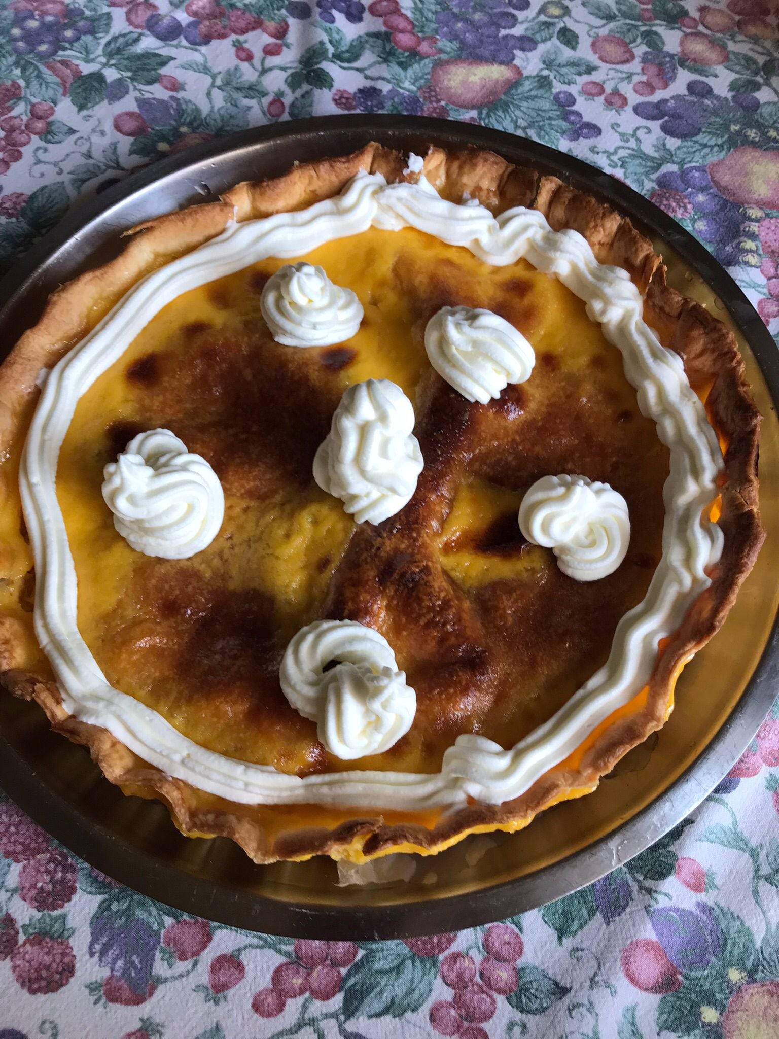 Se ponen las yemas en un bol con la nata y se mezcla bien sin batir, se añade el azúcar y se sigue revolviendo, la vainilla hasta que esté bien incorporada, añadimos entonces la leche, mezclamos bien y ponemos esta mezcla dentro de la tarteleta ,a la que habremos quitado el papel y los garbanzos y la volvemos al horno a 180º una media hora o hasta que esté cuajado el flan y un poquito dorado, dejar enfriar, desmoldar y servir con nata montada y unas cerecitas o con el adorno que quieras.