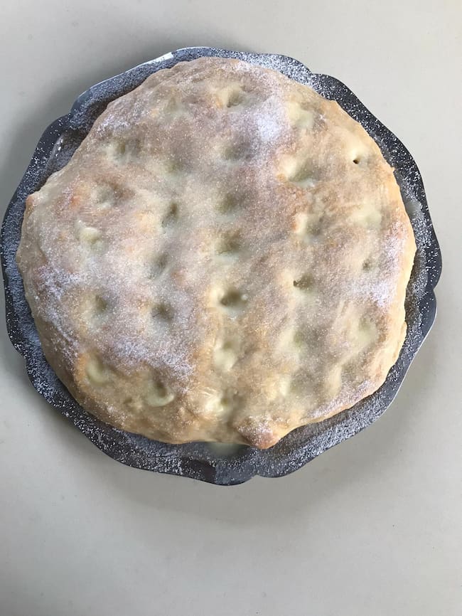 Amasamos todos los ingredientes de la masa menos el azúcar y la mitad de la leche que los vamos echando a partir de la mitad del amasado , cuando esté la masa sacamos y boleamos. Ponemos la masa en un bol untado con aceite de girasol, tapamos con un film y dejamos levedar entre 1 y 2 horas, si tenemos problemas con los levados o no sabemos calcular hacer como me enseñó a mi mi amiga Roski, de Noia, hacerla por la tarde y dejar dentro del horno, con el horno apagado de un día para otro, solo es para que no tenga corrientes, o si no dentro de la nevera. Por la mañana Sacamos la masa veréis que maravilla lo que ha crecido y la extendemos con las manos , hacemos dos porciones, formamos círculos, para que nos queden totalmente redondas las tortas cogemos 2 moldes desmontables, forramos la parte de abajo con papel de horno y lo doblamos hacia abajo, colocamos la masa encima, la estiramos con la mano que ocupe todo el disco, colocamos el aro ,los tapamos y dejamos levedar otra vez hasta que doblen su volumen, mientras tanto tanto ponemos la nata al fuego junto con el queso y el azúcar y dejamos hervir hasta que espese un poquito ,apagamos y reservamos . Una vez que hayan levado las tortas hacemos unos hoyos con los dedos o con un corcho que lleguen bien hasta el fondo y metemos al horno precalentado a 180º unos 15 minutos, no se debe tostar sino quedar blanquita. Cuando aún esté caliente rellenamos los huecos con la mezcla de nata , pinchamos con un palillo para que se cuele toda la nata para el fondo y volvemos a llenar con la nata hasta acabar la mezcla .Dejamos templar y espolvoreamos abundantemente con azúcar glas. Esta deliciosa y lista para comer.