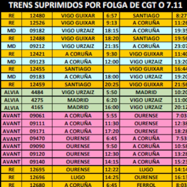 Concretamente se suprime el tren Ourense-Lugo de las 12:22 y el de Lugo-Ourense de las 14: 25. Además de los tres A Coruña-Ourense de las 5: 55, 11: 30 y 17:20. De igual forma las líneas Ourense-A Coruña de las 6:45, 9:50, 12:30, 14:15 han quedado eliminadas para esos días.