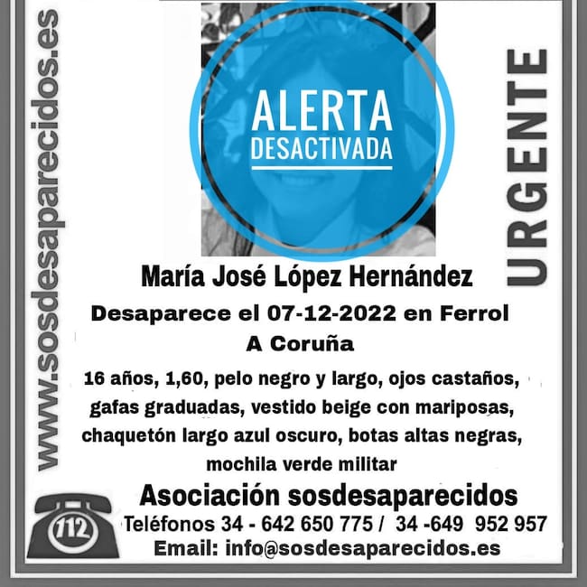 La plataforma SOS Desaparecidos ha comunicado este jueves la aparición en buen estado de María José López Hernández, una ferrolana de 16 años que permanecía en paradero desconocido desde la jornada de este miércoles.