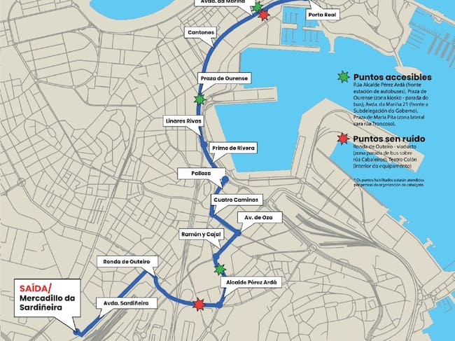 El recorrido contará con cuatro puntos accesibles y dos sin ruido. Los primeros estarán en la calle Alcalde Pérez Ardá, en la plaza de Ourense; en La Marina, frente a la Subdelegación del Gobierno y en María Pita, en la zona lateral próxima a la calle Troncoso. Los segundos estarán en el viaducto de la Ronda de Outeiro y en el Teatro Colón.