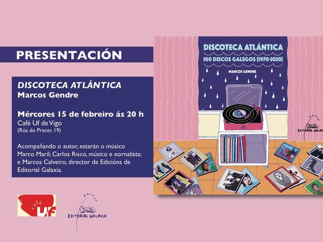 Este mércores 15 de febreiro, celebrarase, ás 20 h, no Café Uf de Vigo, a presentación de "Discoteca Atlántica", de Marcos Gendre. Un libro que abarca a música galega dende 1970 a 2020. “Neste apaixonante volume atopamos discos que crearon na escola e definiron estilos, discos premiados e supervendas fronte a discos descoñecidos polo gran público que para moitos son discos de culto e fundamentais no desenvolvemento da música no país. Aquí hai discos que salvaron moitas vidas. Porque, en moitas ocasións, a música é o mellor salvavidas, a mellor medicina para o corpo e a alma”. Así comeza o prólogo do libro, da man do profesor, xornalista e escritor Fernando Fernández Rego.