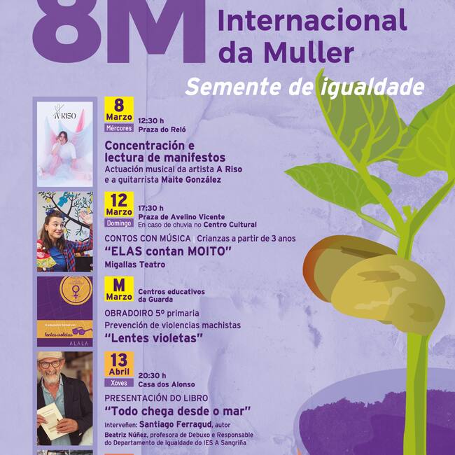 O Concello da Guarda aposta durante todo o ano pola Promoción da Igualdade entre mulleres e homes en todas as esferas da vida e pola visibilización da muller ao longo da historia, por esa razón, se busca darlle continuidade ao programa “Semente de Igualdade”, unha campaña na que se inclúen as accións polo Día Internacional da Muller con actuacións musicais, obradoiros e contos para crianzas, entre outras.