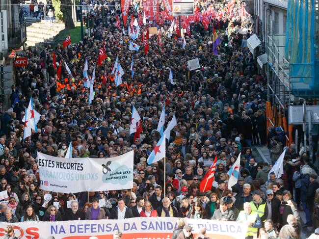 SANTIAGO DE COMPOSTELA, 12/02/2023.- Miles de personas, convocadas por SOS Sanidade Pública, plataforma que en Galicia agrupa sindicatos, partidos, y organizaciones sociales y profesionales, durante la manifestación contra el colapso de las urgencias en hospitales, el aumento de las listas de espera y en defensa de la atención primaria, esta mañana en Santiago de Compostela.- EFE/Lavandeira jr / Lavandeira jr (EFE)