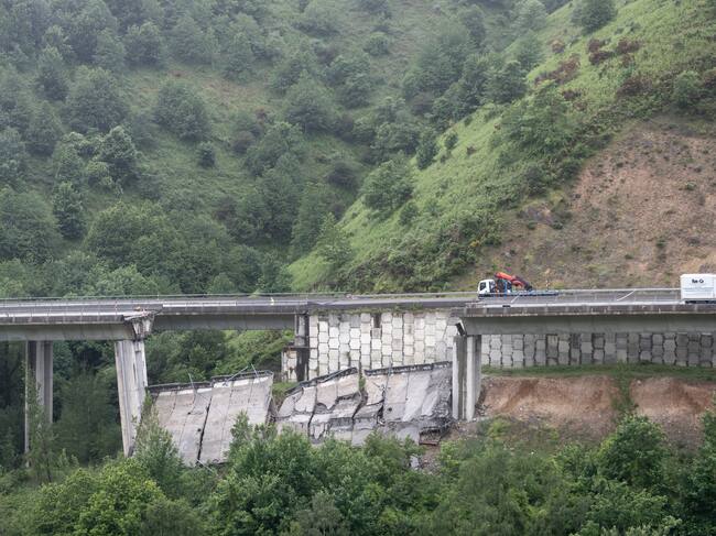 VEGA DE VALCARCE (LEÓN), 08/06/2022.- Parte del viaducto del Castro de la autovía A-6, a su paso por Vega de Valcarce (León), se ha derrumbado por causas que se están investigando sin que se hayan registrado daños personales ya que el tramo se encontraba cerrado al tráfico. Se produjo un desplome de las vigas que sustentaban el viaducto, que desde junio pasado se encontraba en obras de reparación, y a causa del derrumbe se vino abajo el tercer vano. EFE/Eliseo Trigo / Eliseo Trigo (EFE)