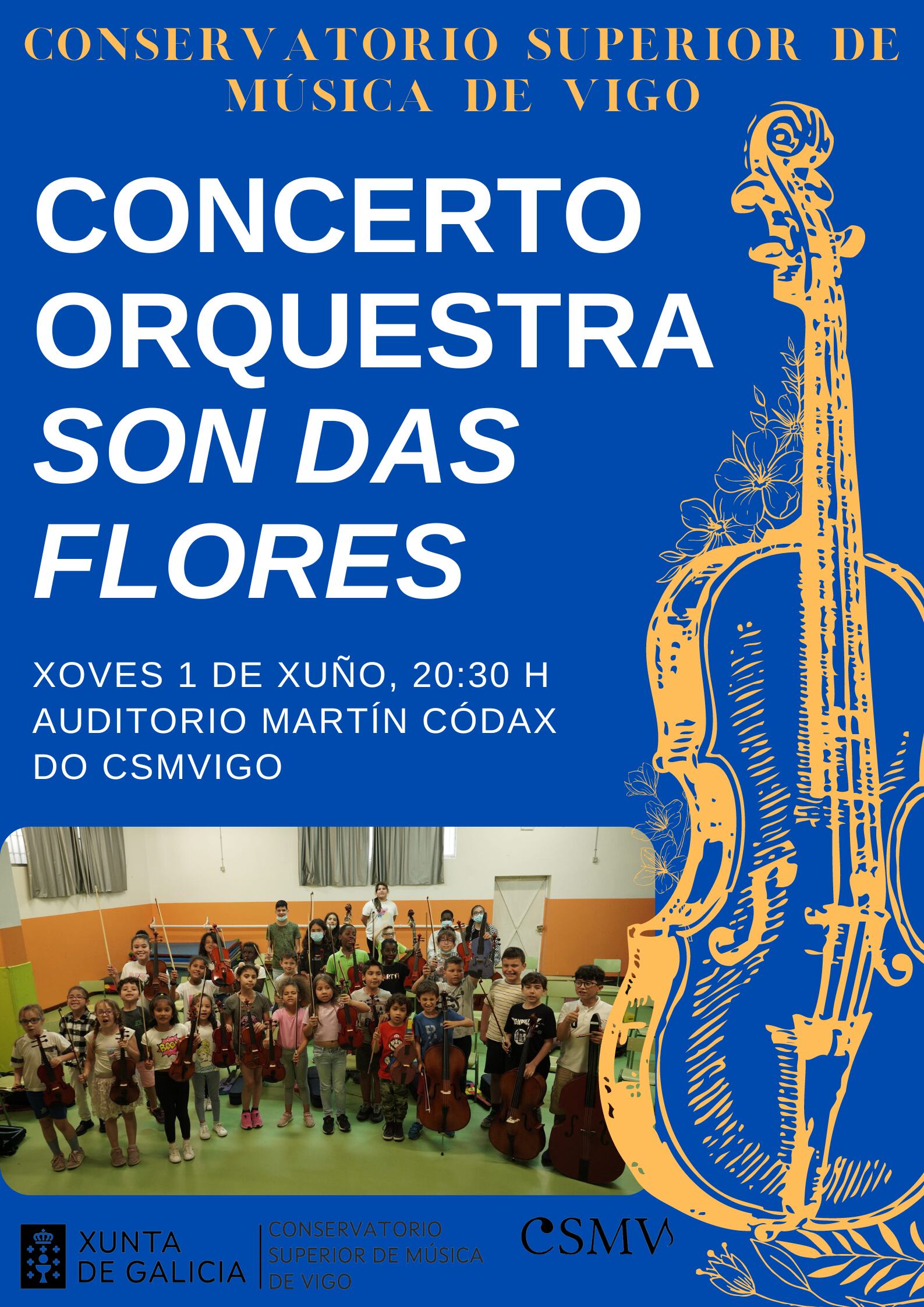 El Auditorio Martín Códax del Conservatorio Superior de Música de Vigo acogerá este próximo jueves, 1 de junio, un concierto muy especial. Sobre el escenario los componentes de la orquesta infantil "Son das flores" del CEIP Vicente Risco de Teis.
