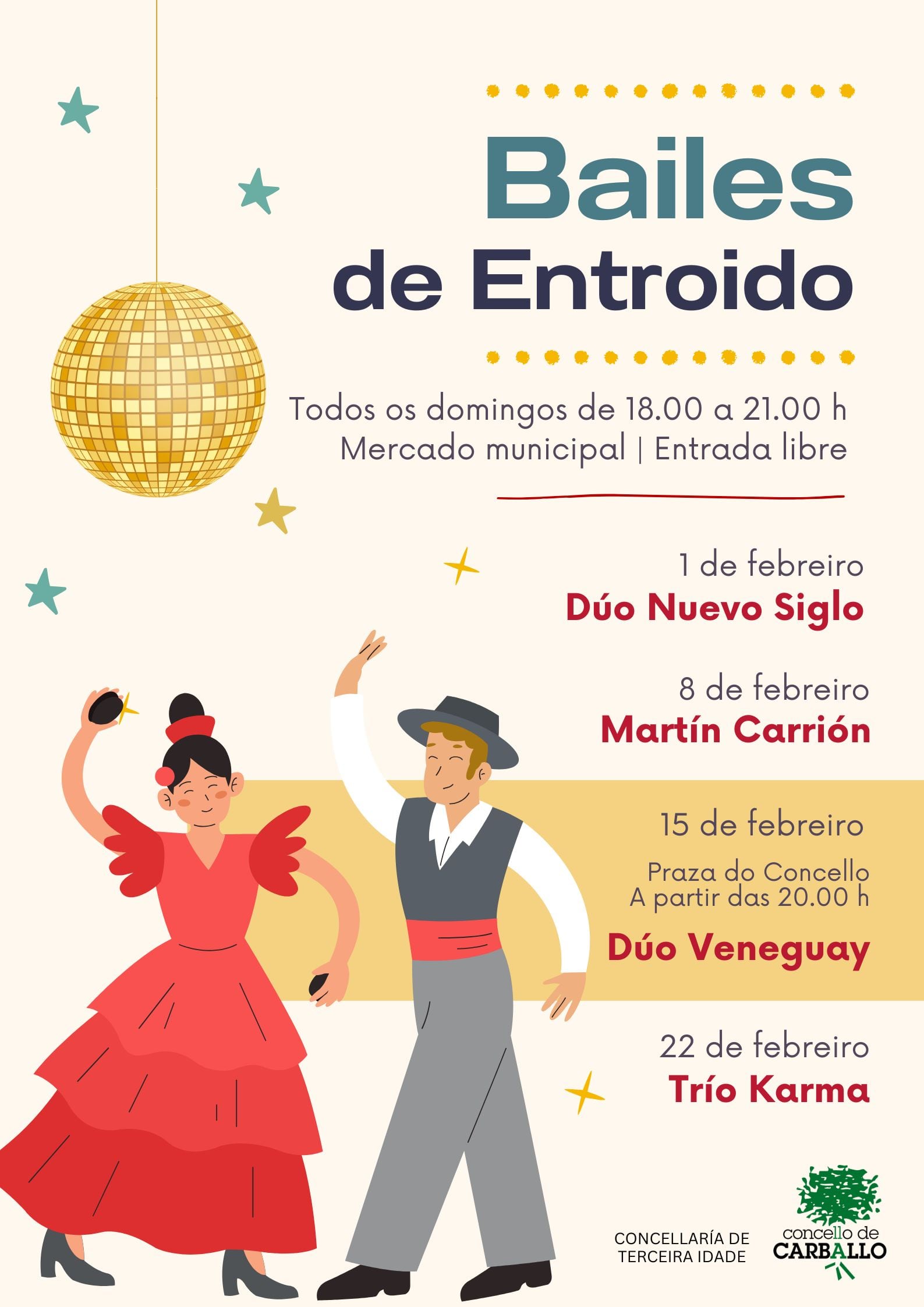 A Concellaría de Terceira Idade organiza todos os domingos, de 18.00 a 21.00 horas, sesións de baile con música en directo no mercado municipal. A entrada é libre e de balde. Este é o cartel para o mes de febreiro