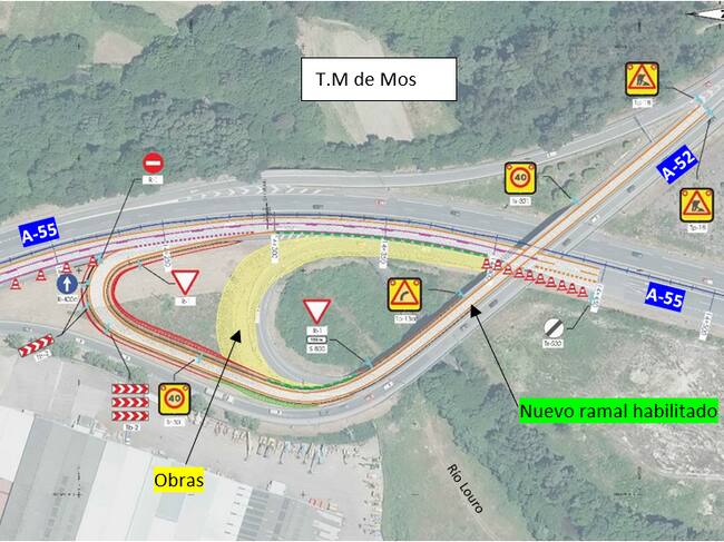 Las obras, ejecutadas por el Ministerio de Transportes, Movilidad y Agenda Urbana, comenzarán a partir de este martes 6 de junio a las 12h00. Desde ese momento, para garantizar la seguridad de los trabajadores y usuarios, se producirá el corte al tráfico del actual ramal de conexión entre las calzadas derechas de las autovías A-52 y A-55 en dirección Tui.