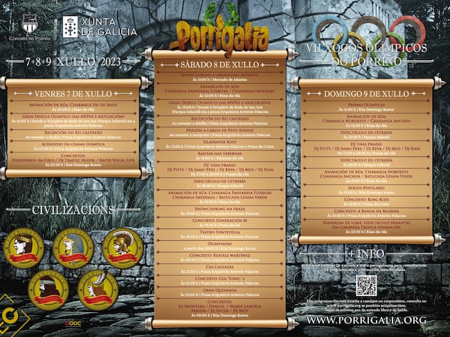 Como non podía ser doutra forma as nenas e nenos estarán moi presentes na programación con actividades pensadas por e para que disfruten ao máximo de Porrigalia. Unha delas a Porrigalia Kids que se celebrará o sábado ás 13h na praza do Concello e no parque do Cristo. A versión olímpica da reputada Gladiator Kids chega ao Porriño para que as pequenas e pequenos demostren que poden ser auténticos gladiadores. As nenas e nenos de 3 a 10 anos disfrutarán dun percorrido de obstáculos adaptado á súa idade para que poidan pasar un rato divertido acompañados dos seus pais ou familiares. A inscrición é gratuíta e pode formalizarse ata o día 6 se de xuño na seguinte ligazón: https://www.deporticket.com/web-evento/8491-porrigalia-kids .