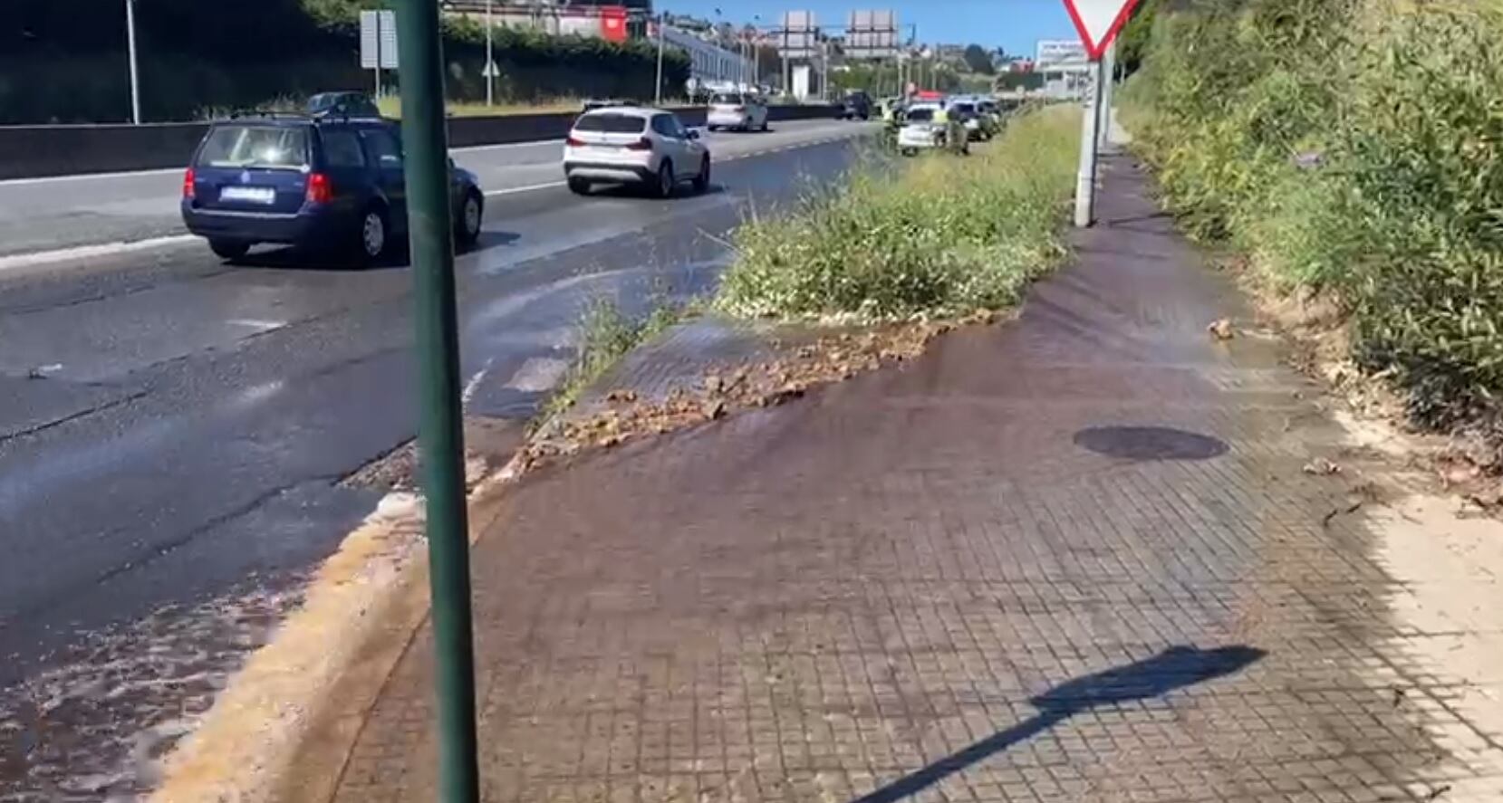 La rotura de una tubería en unas obras en el monte de Eirís anega parte de los accesos a A Coruña desde A Pasaxe