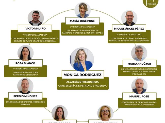 Mónica Rodríguez será, ademais da alcaldesa, a responsable en materia de Persoal e tamén no departamento de Facenda. Víctor Muíño ocupará a primeira tenencia de alcaldía e María José Pose a segunda. O concelleiro encargarase das áreas de Medio Rural, Medio Ambiente, Augas e Parque Empresarial. Pose detentará Benestar Social, Sanidade, Igualdade e Atención Cidadá. O resto do goberno o completan Miguel Ángel Pérez (Obras, Urbanismo, Ilñuminación e Parque Móbil), Rosa Blanco (Cultura, Patrimonio e Biblioteca), Mario Andújar (Ensino, Formación, Emprego, Edificios Municipais e Policía Local), Sergio Miñones (Deportes, Mocidade e Festexos), MAnuel Pose (Ornato Municipal, Protección Civil e Hostalería), Beatriz Pazos (promoción Económica, Turismo, Comercio e Asociacionismo) e Josefa Campos (Terceira Idade, Familia, Mercados e Consumo).