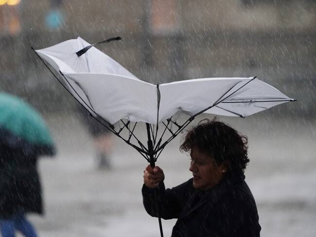 SANTIAGO DE COMPOSTELA, A CORUÑA, SPAIN - OCTOBER 19: A woman holds an umbrella during the passage of squall 'Aline' on October 19, 2023, in Santiago de Compostela, A Coruña, Galicia, Spain. Squall Aline, the first squall considered to have an impact this season, has made its presence felt in Santiago de Compostela. Intense rainfall has left between 25 and 30 liters of water per square meter. The heavy rainfall, wind and waves have left incidents in several areas of the community, such as falling trees and occasional flooding. The storm has caused in Galicia more than 260 incidents recorded by 112 since noon yesterday, Wednesday, October 18, until the early hours of this morning. (Photo By Alvaro Ballesteros/Europa Press via Getty Images) / Europa Press News