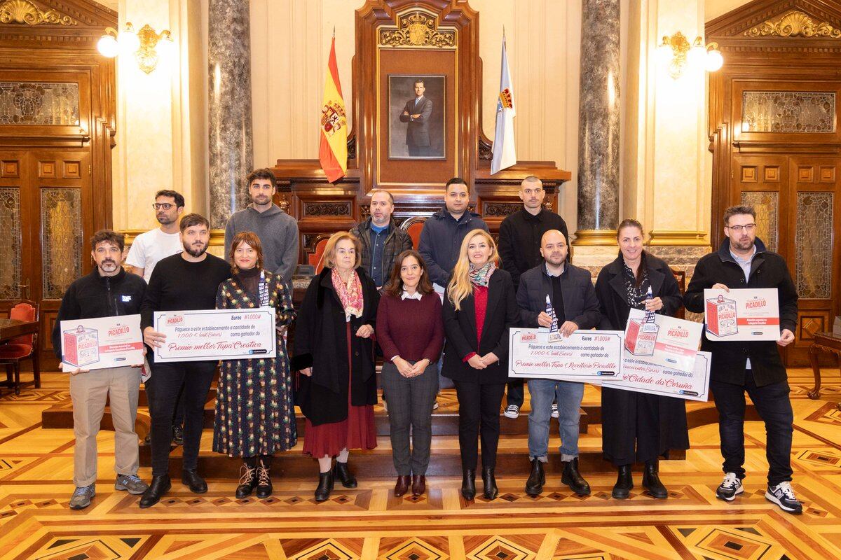 Ajetreo Taberna y Taberna Triay han sido los establecimientos hosteleros ganadores del concurso de tapas Picadillo de este año. El Ajetreo ha conseguido dos de los tres premios del certamen con su receta "Pataca da horta": en la categoría Recetario Picadillo y Ciudad de A Coruña. Su tapa ha sido la más votada por el público que participó en el concurso. Hoy ha habido foto de familia en el salón de plenos del Concello con la alcaldesa Inés Rey.