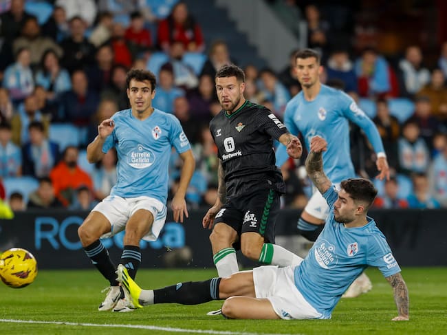 VIGO (PONTEVEDRA), 03/01/2024.- El defensa del Real Betis Aitor Ruibal (c) anota el primer gol del partido durante un encuentro correspondiente a la jornada 19 de LaLiga EA Sports disputado este miércoles entre el Celta de Vigo y el Real Betis en Balaidos, Vigo. EFE/ Salvador Sas / Salvador Sas (EFE)