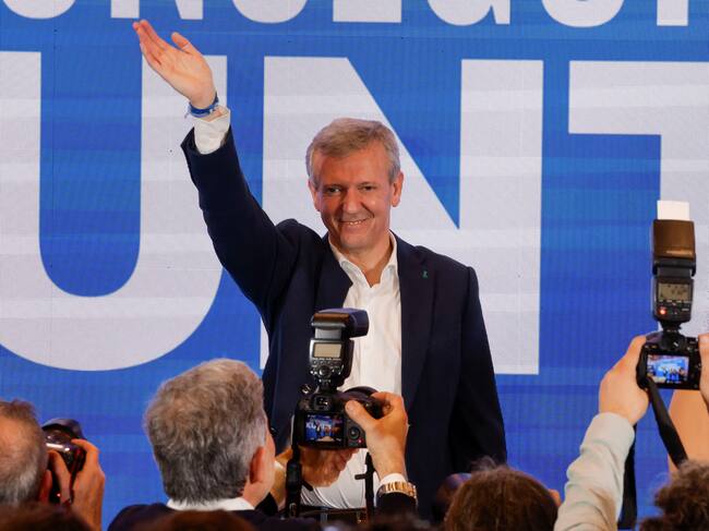 -FOTODELDIA- SANTIAGO DE COMPOSTELA, 18/02/2024.- El candidato Popular a la Xunta, Alfonso Rueda, saluda tras resultar ganador de las elecciones gallegas este domingo, en Santiago. El resultado de las elecciones gallegas del 18 febrero deja la quinta mayoría consecutiva del PP, la primera con Alfonso Rueda al frente, un fuerte crecimiento del BNG, que ha concentrado el voto por el cambio aunque de forma estéril, una caída a mínimos históricos del PSdeG y la entrada en la Cámara autonómica de la formación localista y populista Democracia Ourensana. EFE/ Lavandeira Jr / Lavandeira Jr (EFE)