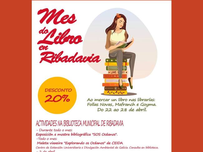 Unha iniciativa que consiste en descontos do 20% en libros de lectura que se merquen nas librarías do concello: Follas Novas, Mafranch e Goyma na semana do 22 ao 28 de abril, ademáis leváranse a cabo varias actividades na Bibliblioteca Municipal do Concello de Ribadavia dedicadas sobre todo aos máis pequenos.