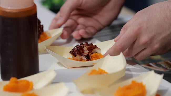 A CORUÑA, 08/04/24.- Emplatado de pulpo durante el Fórum Gastronómico de A Coruña, que reúne a 27 estrellas Michelin en una serie de jornadas de divulgación del mundo de la hostelería que se celebra hasta mañana martes. EFE/Cabalar / Cabalar (EFE)