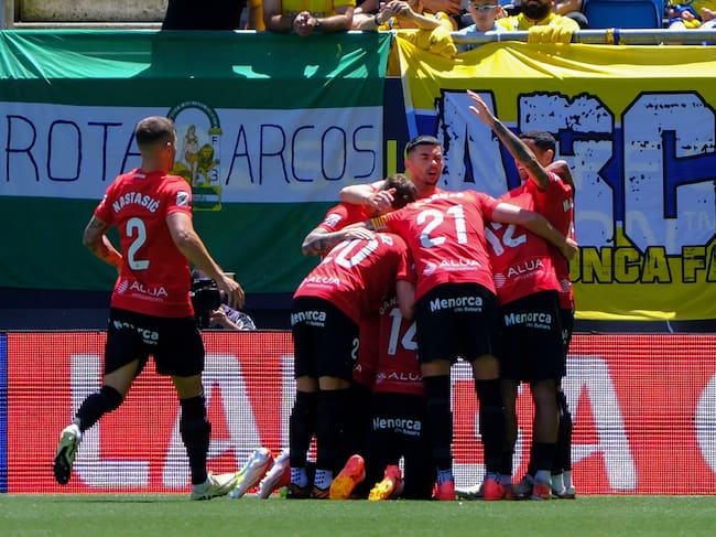 CÁDIZ, 28/04/2024.-Los jugadores del Mallorca celebran el gol del delantero kosovar del Mallorca Vedat Muriqui, durante el partido de LaLiga de la jornada 33, este domingo en el estadio Nuevo Mirandilla de Cádiz. EFE/ Román Ríos / Román Ríos (EFE)