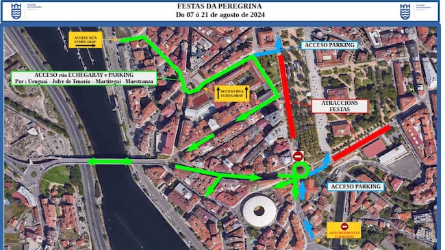 También habrá medidas especiales de tráfico los tres días en los que habrá fuegos artificiales: el sábado día 10, el jueves 15 y el domingo 18. Desde el día anterior a las tres de la tarde hasta el día siguiente a las 8 de la mañana se prohibirá aparcar en el estacionamiento disuasorio situado frente al pabellón de los deportes para el montaje del material pirotécnico. Y justo en el momento de la tirada, entre las 23:00h y las 01:00h se cortará el tráfico desde el puente das Correntes al puente de los Tirantes; y desde Padre Amoedo hasta la rotonda del pabellón de los deportes.
