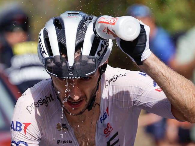GRANADA, 25/08/2024.- El ciclista del equipo UAE Team Emirates Adam Yates cabeza de carrera durante la novena etapa de la Vuelta Ciclista a España, este domingo. El primer bloque de la 79 Vuelta ciclista a España se cierra este domingo en Granada por todo lo alto con un menú de muy alta montaña, la segunda con más desnivel acumulado con 4.370 metros, en la que ninguno de los favoritos al maillot rojo final podrá esconderse y que además no tendrá final en alto. Se trata de un recorrido de 178,5 kilómetros con salida en Motril y tres ascensos de primera categoría: el puerto de El Purche y dos pasos por el Alto de Hazallanas. EFE/ Javier Lizón / Javier Lizón (EFE)