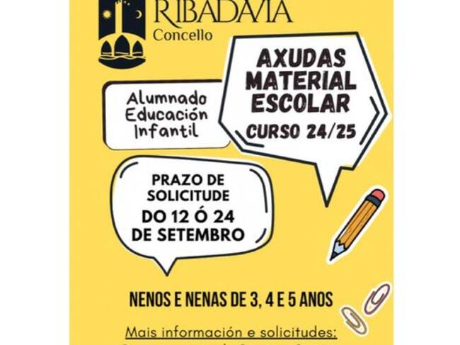 O Concello de Ribadavia convoca Axudas de Material Escolar para o Curso escolar 2024-2025. O prazo de solicitudes está aberto ata o día 24 de setembro.