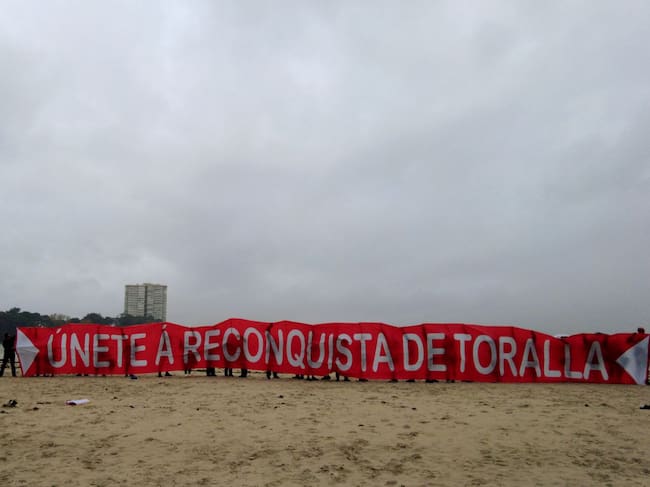 Han desplegado a lo largo del arenal una gran pancarta con el lema "Únete á reconquista de Toralla"