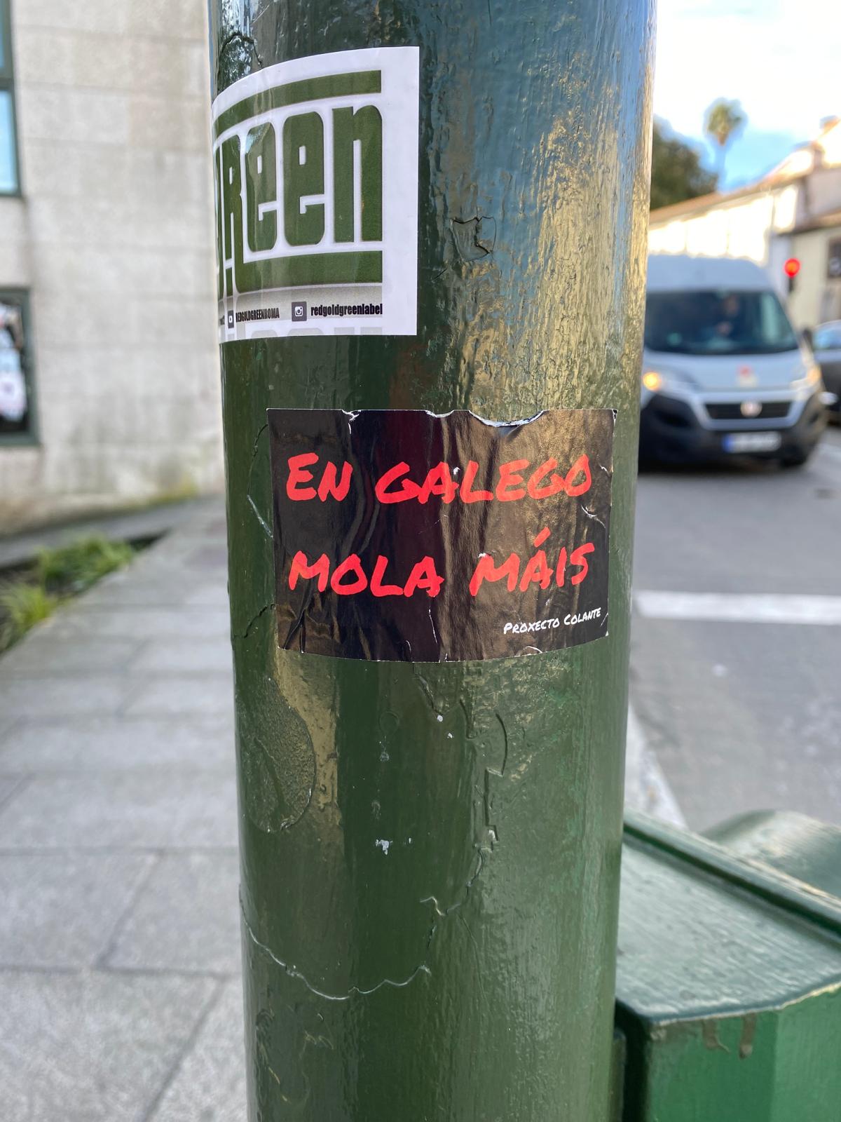 Carteles y pegatinas de Altri, el gallego y el 8M en las calles cabrean al PP: "Veñen da imprenta do BNG e dos seus satélites"