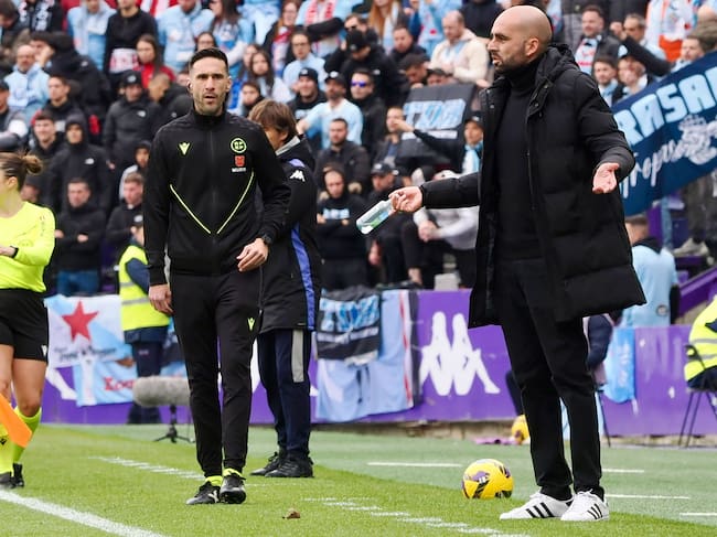 VALLADOLID (ESPAÑA), 15/03/2025.- El entrenador del Celta de Vigo, Claudio Giraldez (d) da instrucciones a sus jugadores ante el Real Valladolid durante el partido de Primera División disputado en el estadio José Zorrilla este sábado. EFE/R.García / R.García (EFE)